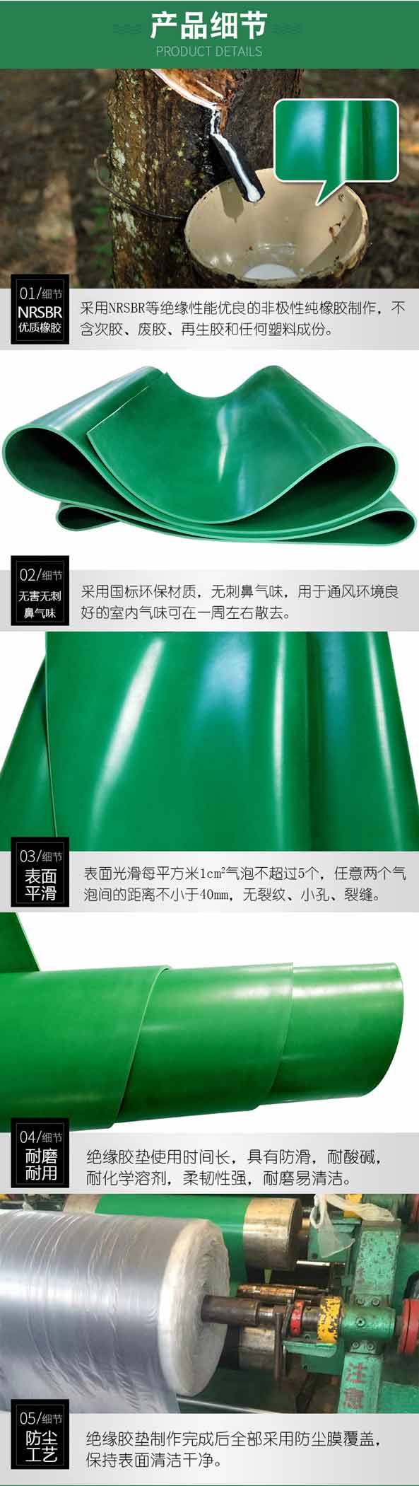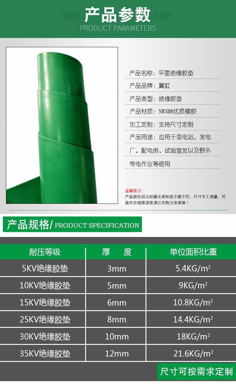 絕緣橡膠板又名橡膠高壓絕緣墊,防靜電膠,板外觀及規格尺寸: 斑痕或凹凸部分的深度或高度不得超過膠板厚度公差,氣泡每平方米內,面積不于1cm2的氣泡不超過5個,任意兩個氣泡間距離不小于40mm,其中雜質深度及長度不超過膠板厚度不小于40mm,膠墊 邊緣不齊或海綿狀部分寬度不超10mm,長度不超過膠板總長的1/10,并且不允許有裂痕。